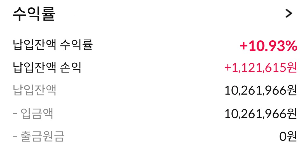현재기준 납입 금액대비 수익률은 +10.91%입니다.