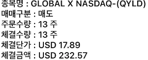 TLT ETF매수를 위해 보통 추가 현금을 납입하지만 이번에는 보유 중인 QYLD ETF를 13주 정도 매도해 현금을 마련했고 해당 현금으로 장 종료 직전에 TLT ETF를 추가 매수 진행 했습니다.