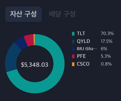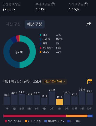 미국주식을 통해 발생하는 연간 예상되는 배당금 또한 전주대비 16.42(7.4%) 달러 증가했습니다. 배당금의 대부분을 현재기준 TLT와 QYLD ETF에 의존하고 있습니다.