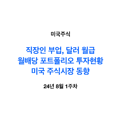 안녕하세요 다양한 투자와 재테크 및 투자 수단을 탐구하는 블로그 자본주의에서 살아남기입니다. 오늘은 직장인으로 달러 부업을 위해 투자 중인 미국주식 월배당 포트폴리오 8월 1주차 투자 현황에 대해 리뷰해 보고 간단하게 미국 주식시장 동향에 대해 리뷰해 볼까 합니다. 8월 1주차는 전 세계 증시 및 자산시장이 급락으로 요동치는 한 주였습니다. 하지만 개인적으로 운영하는 미국주식 포트폴리오는 운이 좋게 오히려 전체 평가 자산이 7% 상승했습니다. 이에 대한 이유와 포트폴리오 자산별 비중에 대한 이야기는 아래 투자현황에서 계속 이어가 볼 계획입니다.