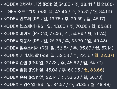 국내 12개 업종별 대표 ETF를 월봉, 주봉, 일봉으로 비교를 통해 산업별 현재 주가가 평균적으로 과매수된 상태인지, 과매도된 상태인지 판단하는 자료로 사용 중입니다. 사람마다 과매도와 과매수 분류 기준 척도는 다르지만 개인적으로 RSI가 30에 가깝거나 미만일 때 과매도 상태로 보고 60에 가깝거나 초과했을 때 과매수 상태로 판단합니다.